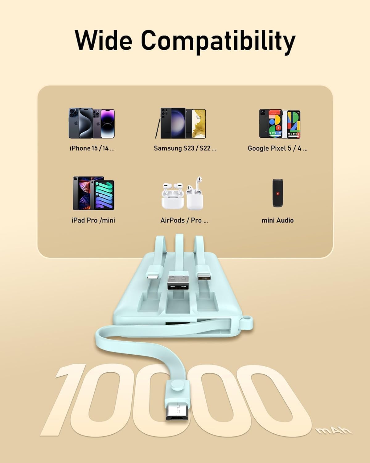 [Portable Phone Charger with Built in Cables] Power bank has built in USB Micro, Type-C, and iPhone cables compatible with iPhone 13/12/11/XR/8/7, iPad, and Samsung Galaxy S20/S21/S22, Tablet, and other smart android devices. The built in USB A input cable for recharge the power bank itself. No need to take any charging cables, perfect battery pack for travel