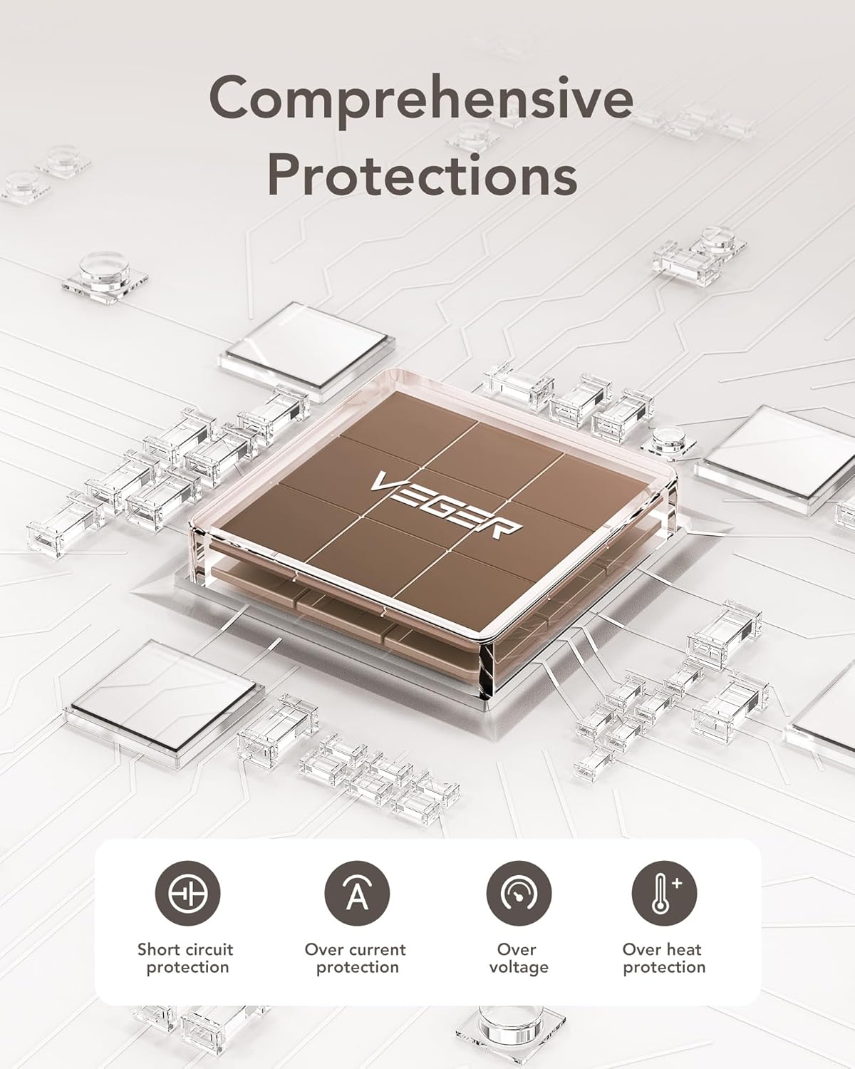Brand VEGER Capacity 10000mAh / 38.5Wh Advantage Wall Plug & Cables Outputs USB A, USB C, Cables, 15W max Inputs 110-220V Wall Plug or USB C 5V-3A Recharging Time 5-6 hours Dimension 5.95” x 2.76” x 0.72” Weight 8 oz