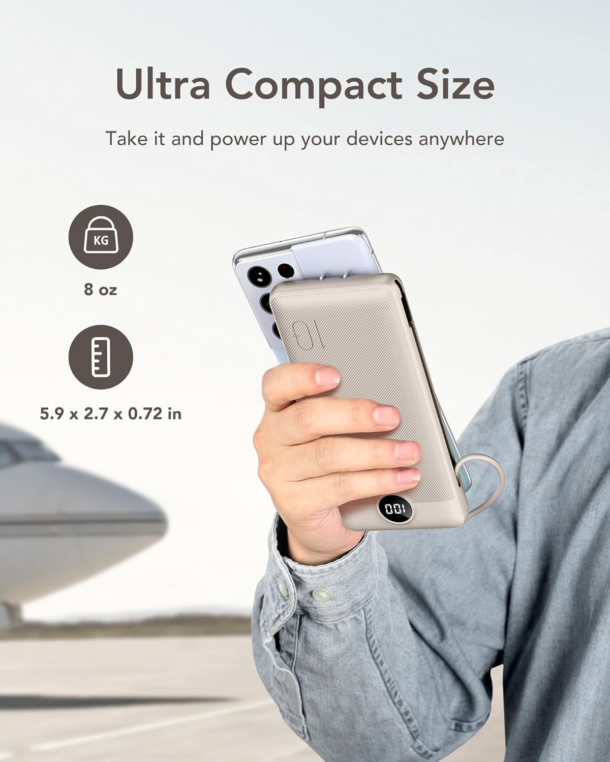 【10000mAh Capacity with Slim Body】: With a slim size of 5.9 x 2.7 x 0.72 inch size, 8oz weight, the external battery is a perfect travel accessory. Full 10000mAh Capacity is enough for daily used, which provides charges 1.8 for iPhone15/14, 1.6 charges for Samsung S23.