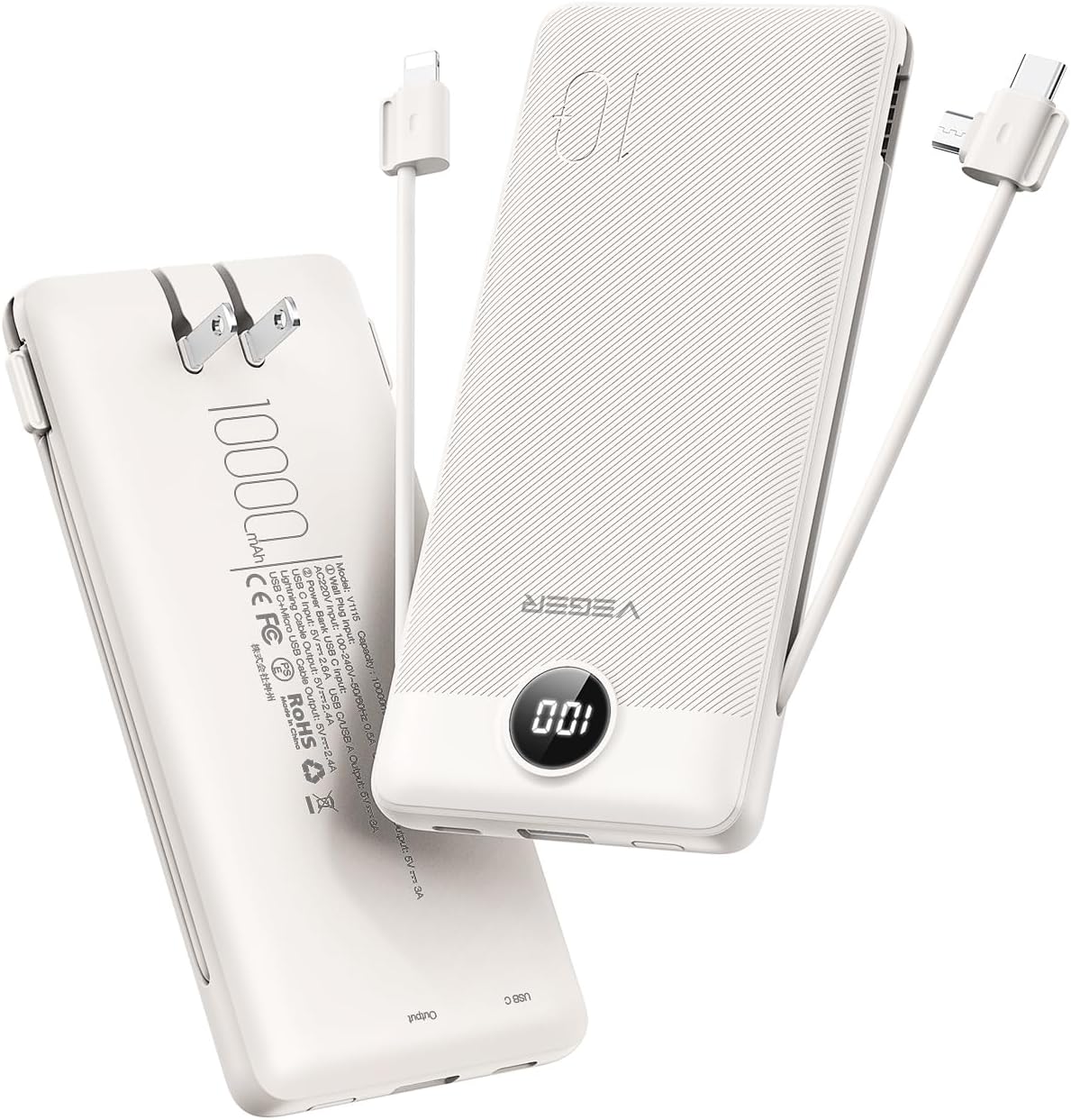 【Portable Charger with Built in Cables】: VEGER 10000mAh portable phone charger built in 3 types cables, Mirco USB, USB C and other type cables, the AC Wall plug built in allows you to recharge itself directly from the wall outlet, do not need to carry adapter and cables everywhere any more.