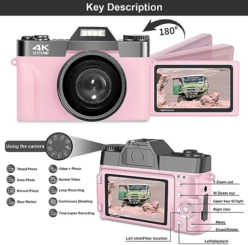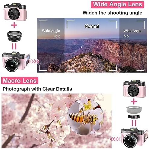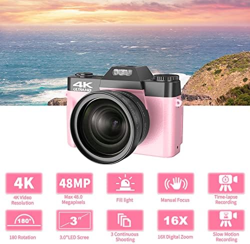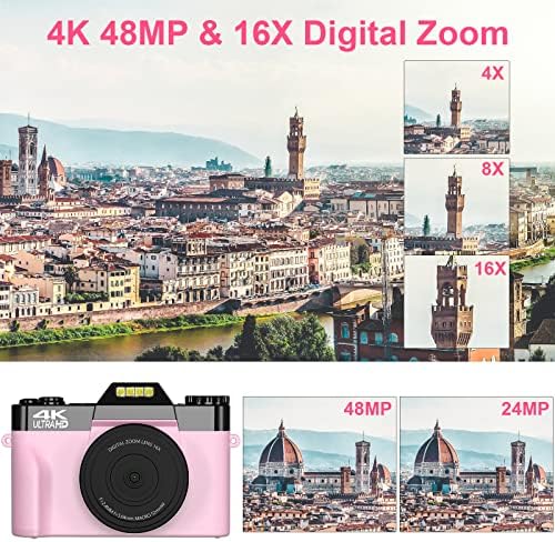 VETEK Digital Cameras for Photography, 4K 48MP Vlogging Camera 16X Digital Zoom Manual Focus Students Compact Camera with 52mm Wide-Angle Lens & Macro Lens, 32G Micro Card and 2 Batteries (Pink)