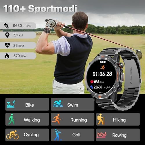 【110+ Exercise Modes】This fitness watches for men has many features you need, providing a better experience with a new way to train and advanced capabilities. It supports 110 professional fitness modes, including Cycle, Run, Walk, Mountaineering, Hiking, and more, accurately monitoring and analyzing multiple data points such as heart rate, steps, and calories burned. Fitness tracker watch for men, calorie tracker watch, steps tracker watch, black stainless steel band smartwatch.