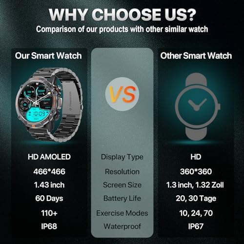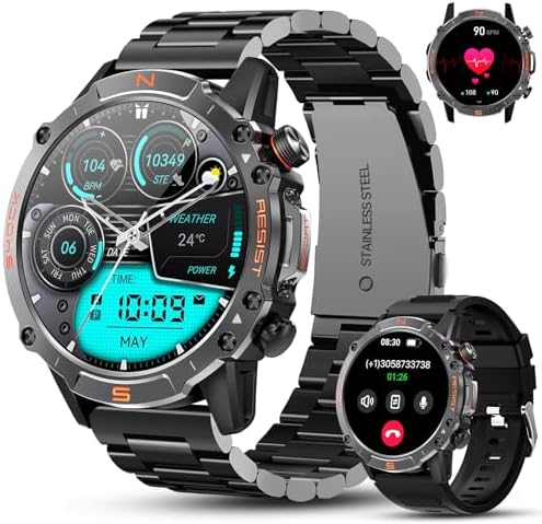Smartwatch for men, fitness watch, blood pressure watch, heart rate monitor watch, rugged smart watch, military smart watches for men, android smartwatch, smart watches for iphone, WalkerFit 2023 Upgrade fitness tracker watch, 1.43 Inch Round Black Stainless Steel Smart Watch