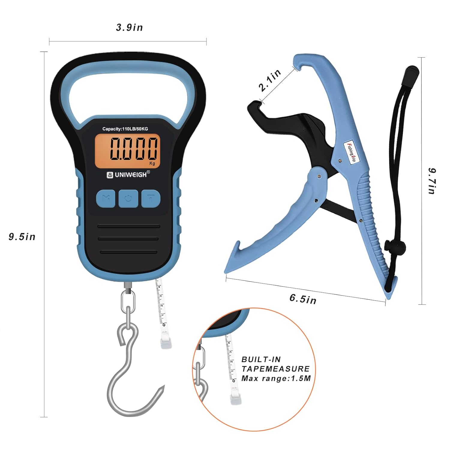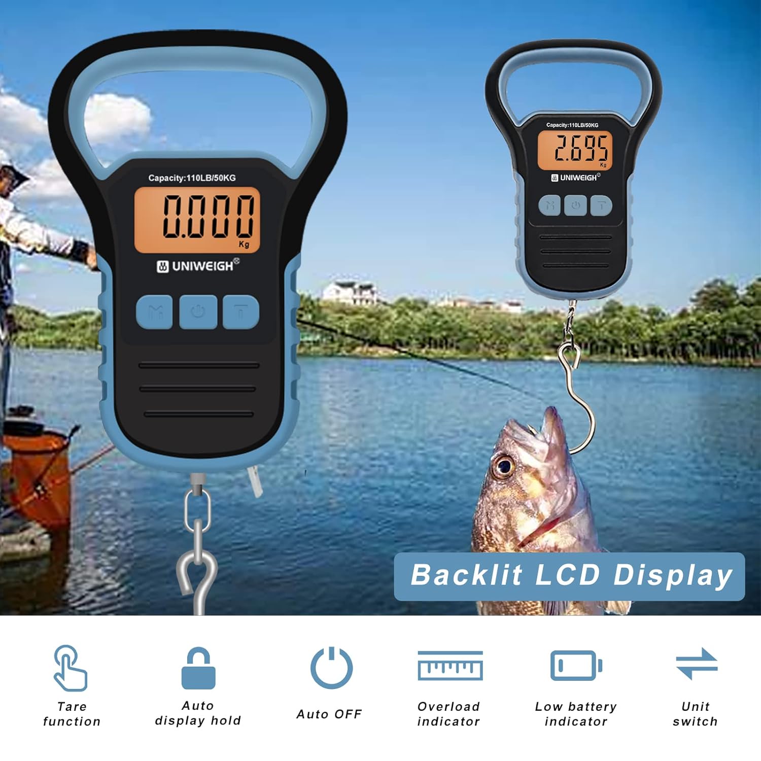 Waterproof Fishing Scale with Lip Gripper,110lb/50kg Postal Hanging Luggage Scale with Hook, Digital Handing Scale with 60inch Tape Measure,Luggage Hook, Backlit LCD Display