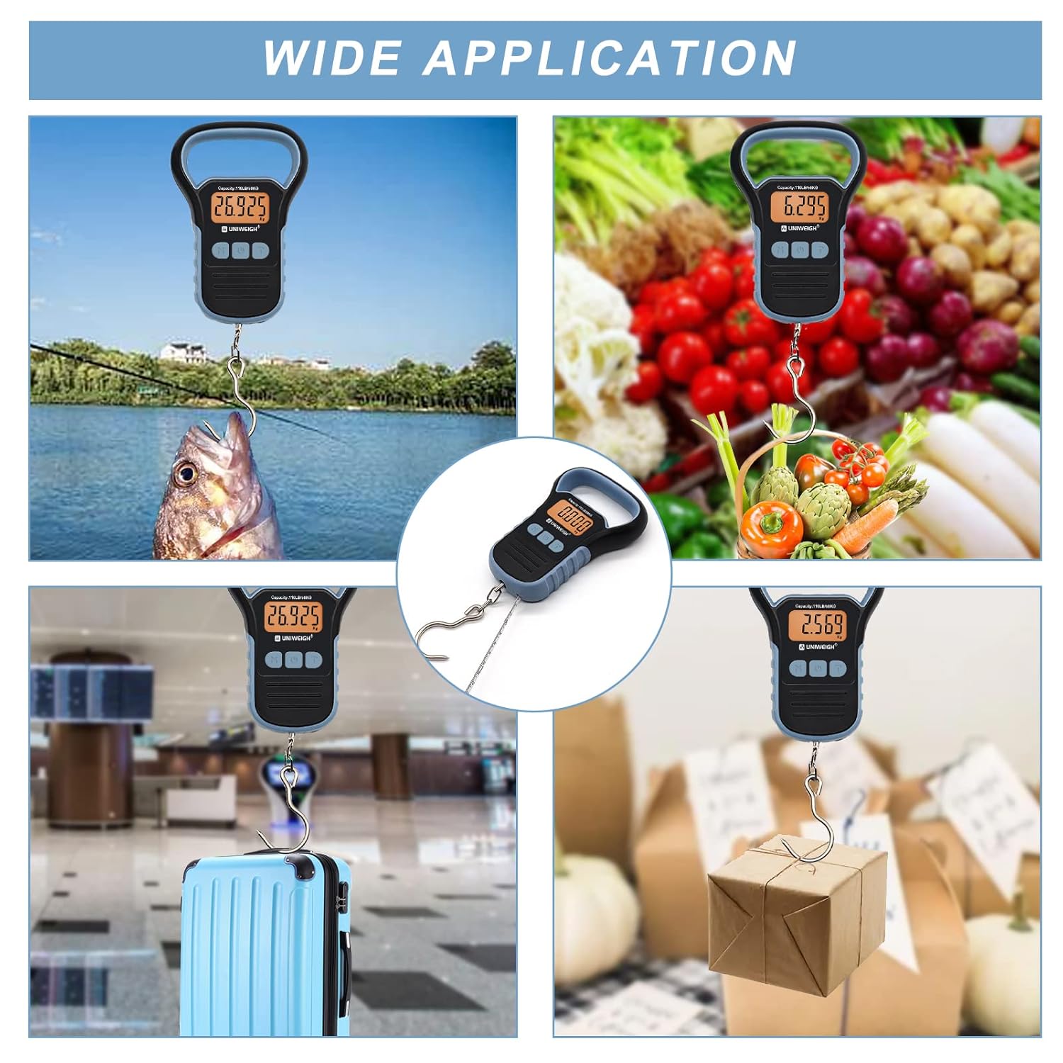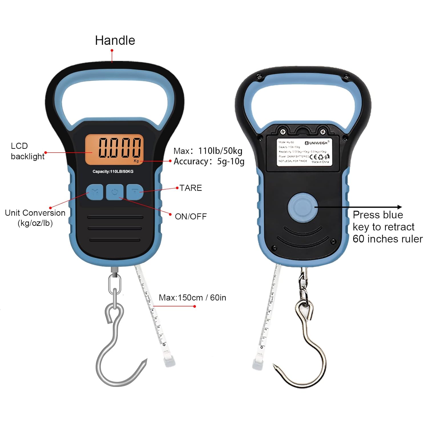 【Tape Measure Design 】Not just for weighing fishing,it comes with a 60-inch(150cm)retractable tape measure, use it to check luggage size, measure the package of express packages, outdoor fishing, etc. suitable for various occasions. Press the back Cyan button to retract the measure tape