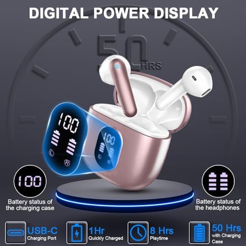 Upgraded 50H Playback and Real-Time Dual LED Displays: On single charge, bluetooth earphones last 8 hours. With the portable charging case, the total playtime could be up to 50 hours. Dual LED power display on the case can help check the charging status of headphones wireless bluetooth and charging case. The Type-C charging port can provide faster and safer charging. Take our earbud wireless bluetooth to travel with you, you can enjoy long-lasting music every day.
