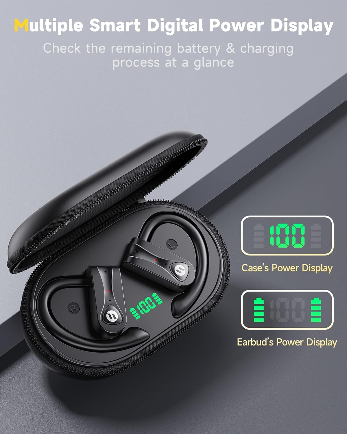 LED Digital Display and Designed for Sports:The LED digital display shows the battery power level of the case and the charging statues of the bluetooth ear buds . Flexible, soft earhooks ensure a secure fit during exercise and long wear, suit for sports
