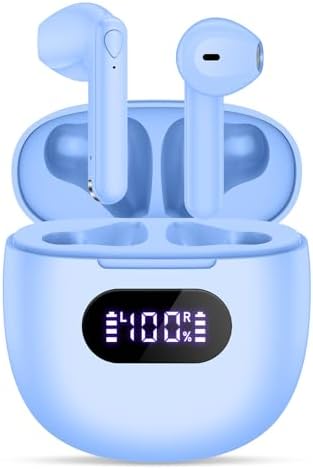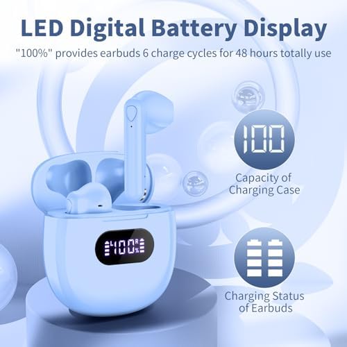 【Digital LED Power Display】 The wireless earbuds are equipped with digital LED power display that shows the charging status of the wireless ear buds and the balance of charging case. The LED light will flash the digits from 1% to 100% when charging for the case, and the flashing battery icon display the charging status of the both ear buds.