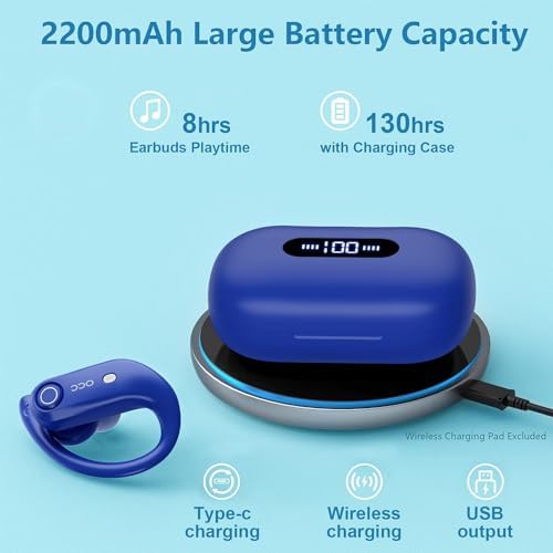 1.130H Playback & Wireless Charging Case with LED Display. Each wireless earbud can last 8 hours of music time on a charge and total 130 hours with the 2200mAh large capacity charging case. The powerful battery allow for all day listening. Dual digital LED power display outside of the case is to show the power level for charging case and bluetooth headphones. The charging case supports USB-C wired fast charging and wireless charging.