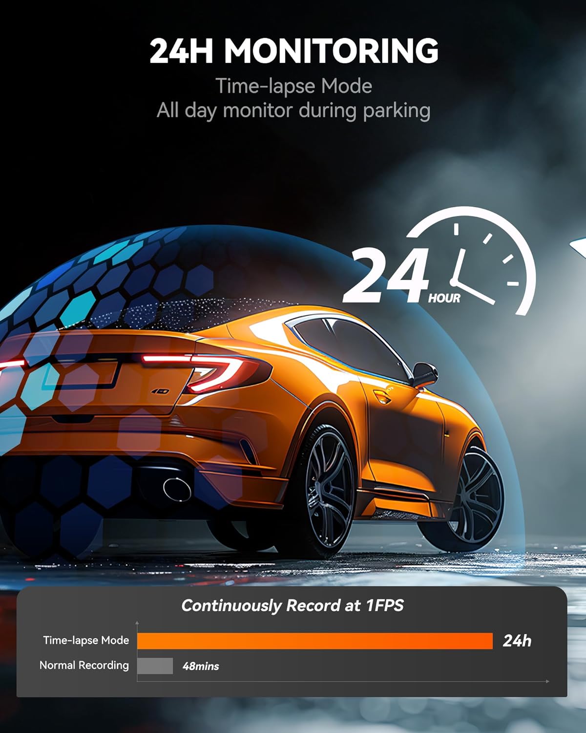 24-HOUR PARKING MONITOR – Beyond on-the-road safety with loop recording, the WOLFBOX camera also features a 24-hour parking monitor. Time-lapse mode records at a low frame rate to conserve power and storage while ensuring continuous surveillance of your vehicle. (A hardwire kit is required for parking monitoring.)