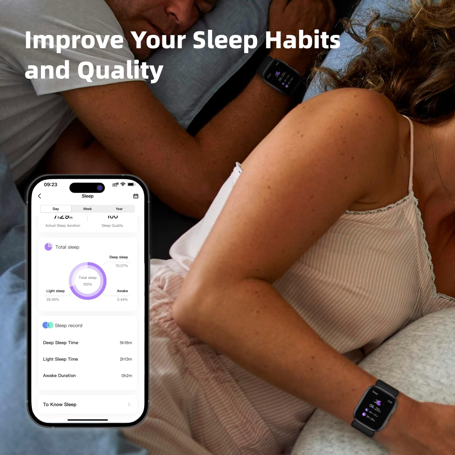 24/7 HEART RATE, BLOOD OXYGEN AND SLEEP MONITORING: The android smartwatch is equipped with a 24/7 heart rate and oximetry sensor to help you monitor the heart rate and oxygen saturation around the clock, and the watch can be set up to alert you of high or low heart rate. The watch also automatically monitors your sleep (18:00-12:00) and provides a comprehensive sleep quality analysis. Besides, we can view health analysis and exception alerts in the fitness watch’s app to help us monitor health.