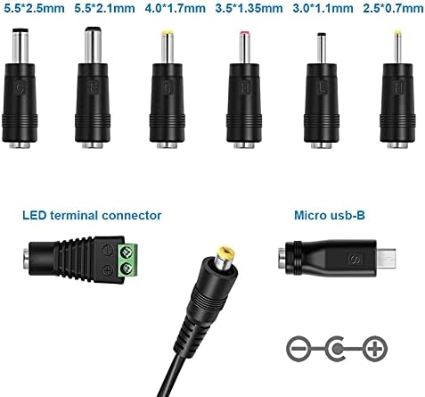 MULTIPLE DC TIPS – A set of popular interchangeable DC connectors. Works with 99% of AC/DC home appliances, such as router, led strips, lamp, webcams, security cameras, HDMI switchers, GPS, kids toys, usb hub, tablets, electronic gizmos, DIY circuits and more. Specially add a Micro USB plug and LED terminal connector, let this versatile adjustable charger works better for you.